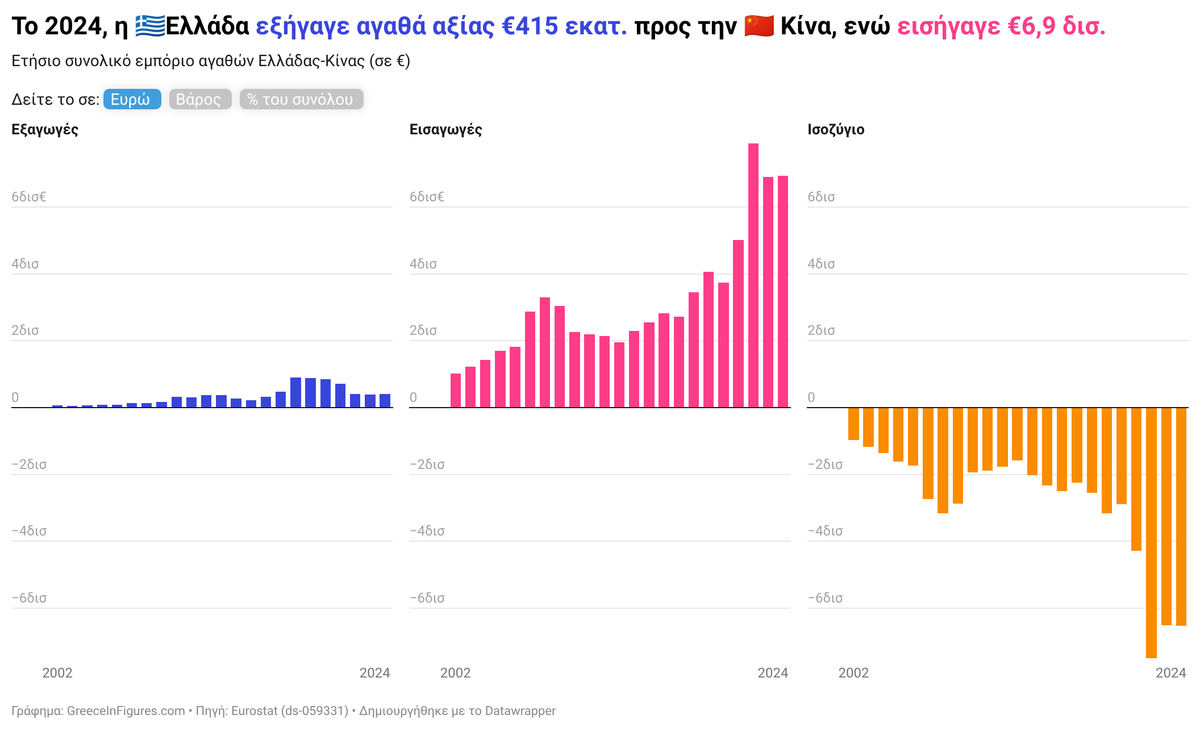 Η Κίνα έχει εδραιωθεί ως ο κύριος προμηθευτής τεχνολογικού και βιομηχανικού εξοπλισμού για την Ελλάδα. Η κατηγορία «Μηχανήματα και υλικό μεταφορών» αντιστοιχεί στο 51% των συνολικών εισαγωγών μας από τη χώρα, με την αξία τους να αγγίζει τα €3,32 δισ. το 2025.
