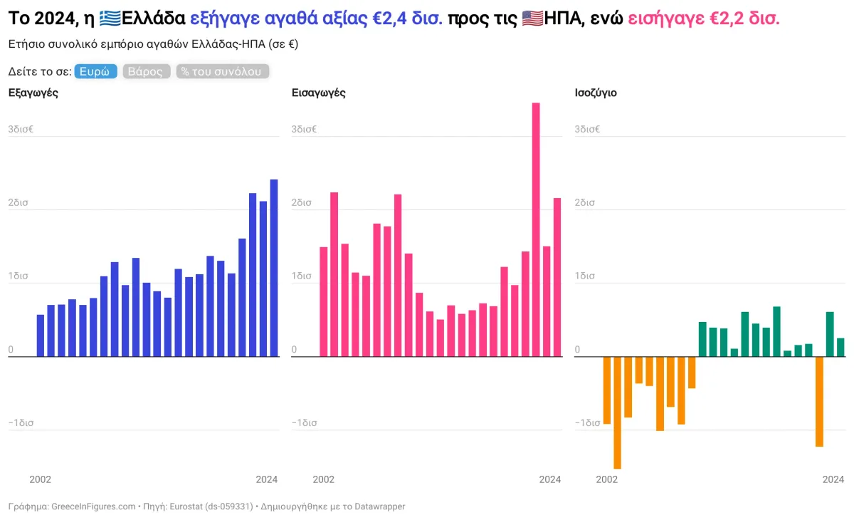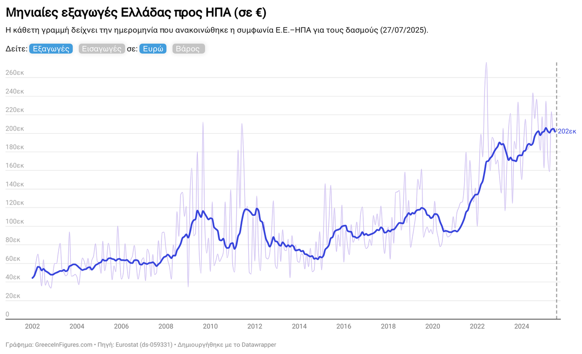 Σε αξία, ο όγκος αυτός μεταφράζεται σε 125 εκατομμύρια ευρώ — πτώση 23,2% σε ετήσια βάση. Οι αμερικανικοί δασμοί αναδεικνύονται σε κεντρικό παράγοντα αυτής της συρρίκνωσης.